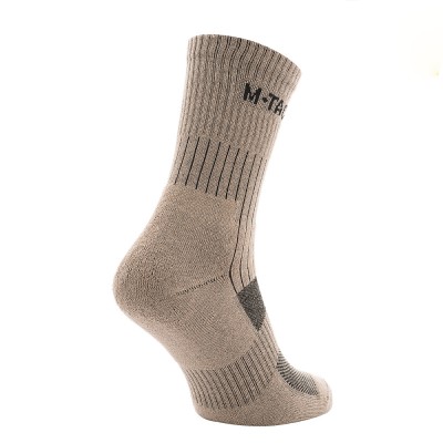 The design of the M-TAC socks includes special thermal zones and damping areas in the forefoot and heel, which partially extend to the foot's ascent. These cushions are designed to protect the foot from rubbing against the inside of the shoe when walking. To improve performance during intense walking, support for the transverse arch of the foot has been added to keep the socks from wrinkling at the bottom of the foot. A wide elastic band evenly distributes the load, keeping the sock on the shin. The entire foot is cushioned by internal terry weaving that evenly distributes the weight of the body over the entire foot. Trekking socks with textured thermal zones absorb most of the moisture and by capillary action, ventila