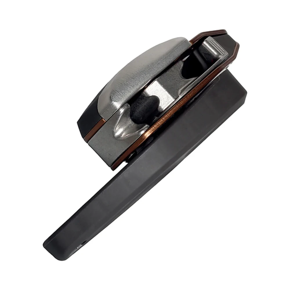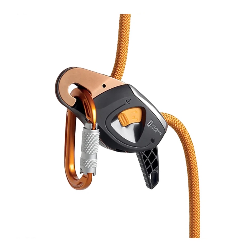 with an unloaded rope, the locking mechanism can be deactivated by pressing the cam and thus the rope can be pulled out of the device without using the lever - this allows the device to be used, for example, for belaying a lead climber or for quick movement on a flat roof