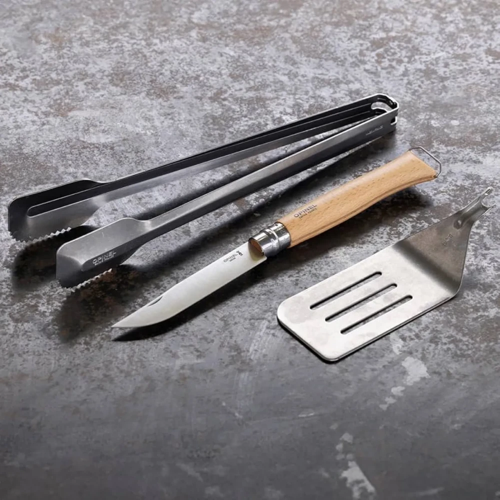 Made in France, the Opinel Grilling Set is ideal for outdoor grilling and over-the-fire cooking. This smart, robust, and efficient set features three premium utensils. The No.12B Stainless Steel Opinel folding knife is perfect for cutting meats, vegetables and fruits, and features a beech wood handle from sustainably managed French forests, equipped with a bottle opener at the end. The large Spatula+ is made of stainless steel and designed to insert into the knife handle and lock into place with the Virobloc locking ring. The stainless steel XL tongs feature a stonewashed finish and are long for convenient cooking over a grill, with notched tips and a grill lift built into the end of the handle.