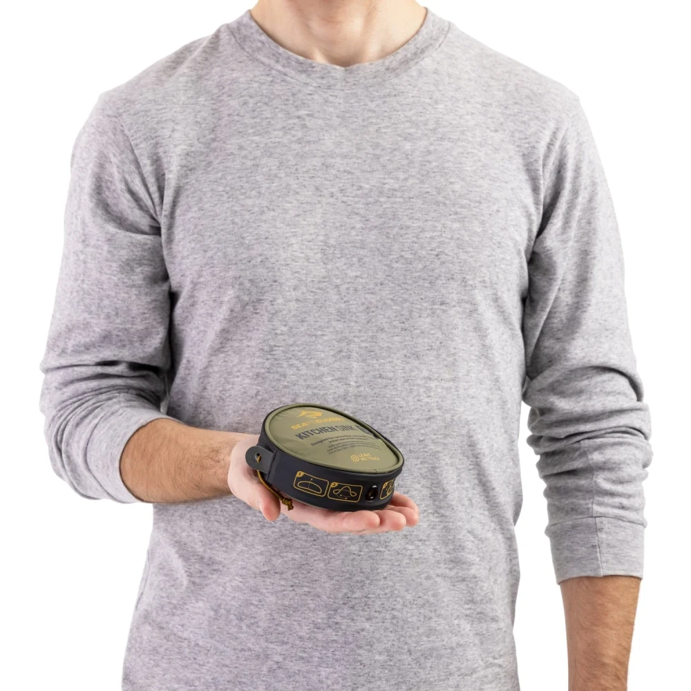 Camping Dish Duty Made Easy: Engineered with a wide base and rigid rim for stability, the Kitchen Sink holds its shape when full. Made from waterproof certified recycled 70D nylon with fully taped seams, it’s watertight, fast-drying, and ideal for washing dishes away from sensitive water sources. It compresses into a palm-sized pouch, making it compact and versatile for all types of camping adventures.