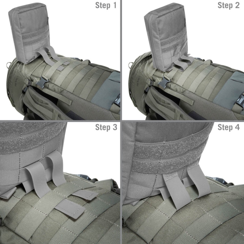 Tänu modulaarsele kinnitussüsteemile saab seljakotile lisada täiendavaid taskuid nii esiküljele kui ka külgedele. Sobivad Tatonka Universal Pouchid (tootekoodid 3032, 3033, 3034, 3035) või ka teiste tootjate MOLLE-süsteemiga taskud (MOLLE = Modular Lightweight Load-Carrying Equipment).