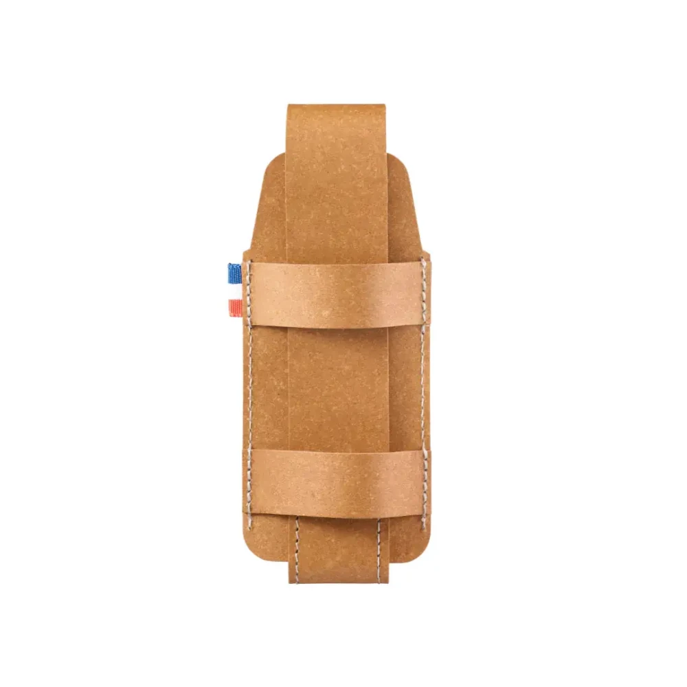 See keskmise suurusega noatasku valmistatakse nahajääkidest ning selle külgedel on taaskasutatud plastpudelitest tehtud R-PET vilti.