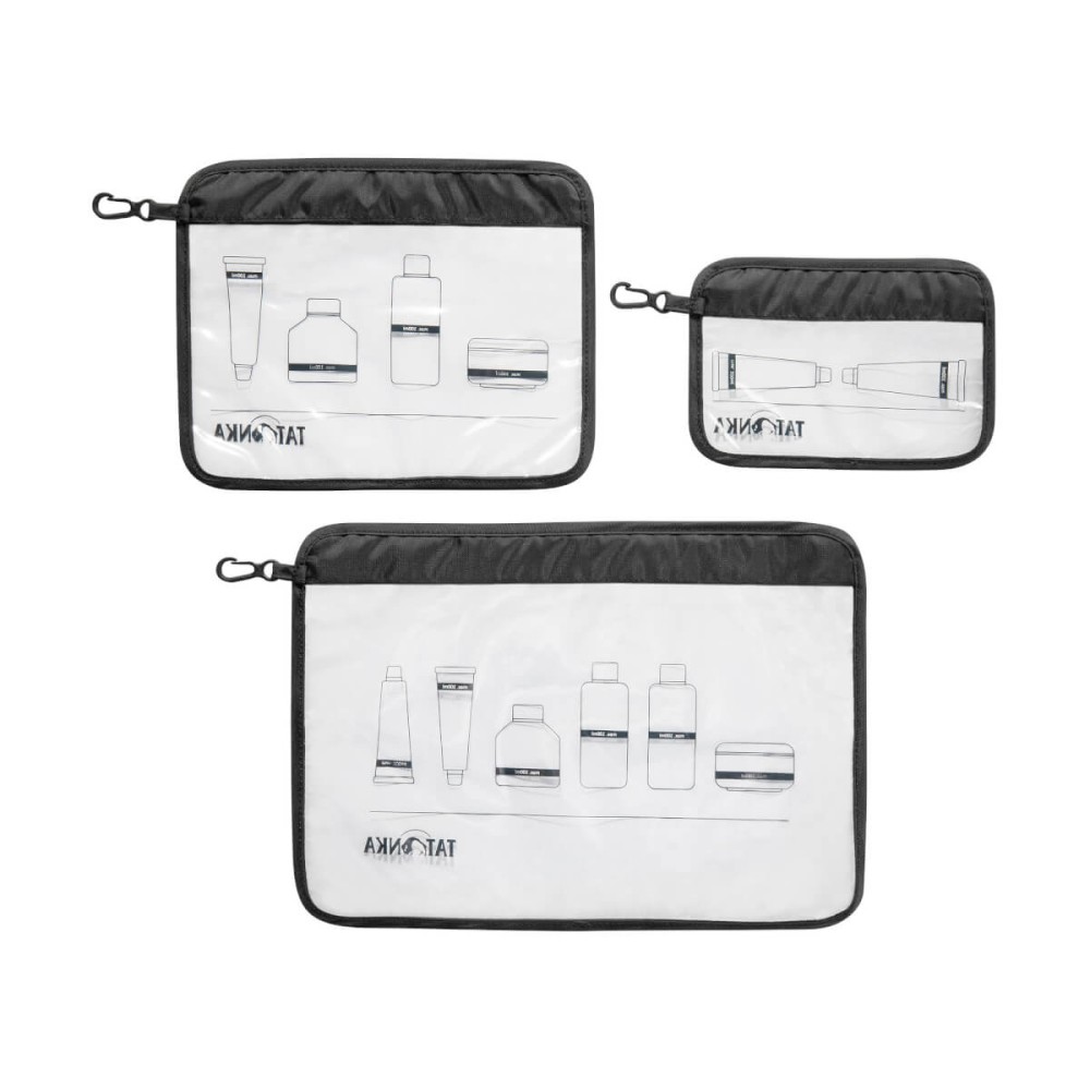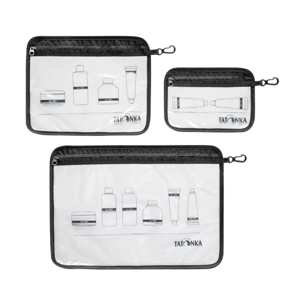 Läbipaistev tualett-tarvete kottide komplekt vedelike kaasavõtmiseks lennukisse.