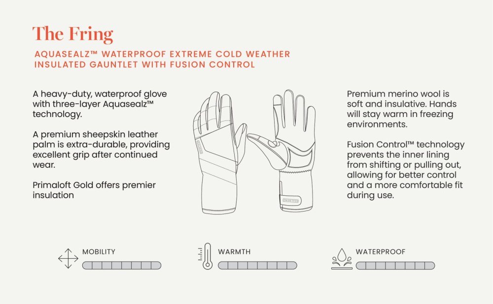 Fring tugevad veekindlad kindad sobivad külmade ja karmide ilmastikutingimuste jaoks. Aquasealz™ tehnoloogia tagab samaaegselt veekindluse ja hea hingavuse. Fusion Control™ ühendab kinda voodri, veekindla membraani ja pealiskihi kolmekihiliseks, hingavaks ja 100% veekindlaks tervikuks. See välistab kihtide liikumise, tagades erakordse osavuse, haarde ja mugavuse külma ning märja ilmaga. Kinnastel on PrimaLoft® Gold Aerogel soojustus ja pehme meriinovillane vooder. Premium lambanahast nahkne peopesa on eriti vastupidav ja pakub suurepärast haarduvust. Kasutamisel muutub nahk veelgi pehmemaks ja mugavamaks, säilitades samal ajal oma tugevuse.
