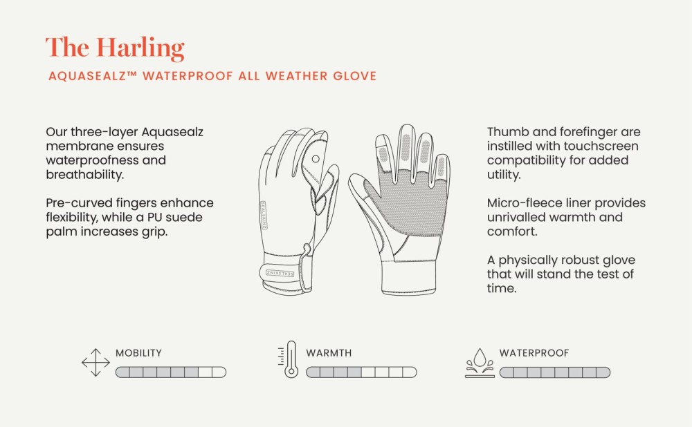 Harling veekindlad rattakindad on kerged ja vastupidavad. Need sobivad välitegevusteks ja eriti jalgrattasõiduks külmades ja märgades tingimustes. Kinnastel kasutatakse Aquasealz™ tehnoloogiat, mis tagab samaaegselt veekindluse ja hea hingavuse, hoides käed kuivana ja mugavana. Kinnaste eelkõverdatud sõrmed parandavad haaret ja kontrolli juhtraual. PU-seemisnahast peopesa pakub vastupidavust ning täpset haarduvust. Pöial ja nimetissõrm võimaldavad kasutada puuteekraaniga telefoni või GPS-seadet kindaid eemaldamata.