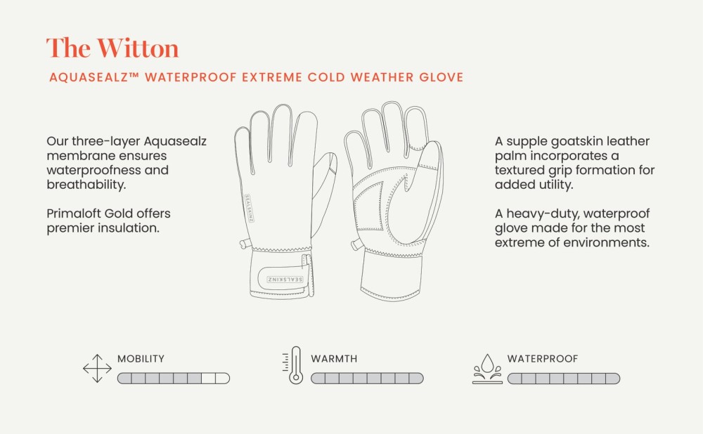 Witton kindad on veekindlad, vastupidavad ja väga soojad. Kinnastel on Primaloft® Gold soojustus. Eelvormitud sõrmed ja kitsenahast peopesa tagavad kindla haarde. Tänu veekindlale ja hingavale Aquasealz™ membraanile ning kolmekihilisele konstruktsioonile kaitseb kinnas tõhusalt niiskuse eest. Pöidlal on fliisist kate, millega saab vajadusel pühkida prillidelt või kiivri visiirilt udu.
